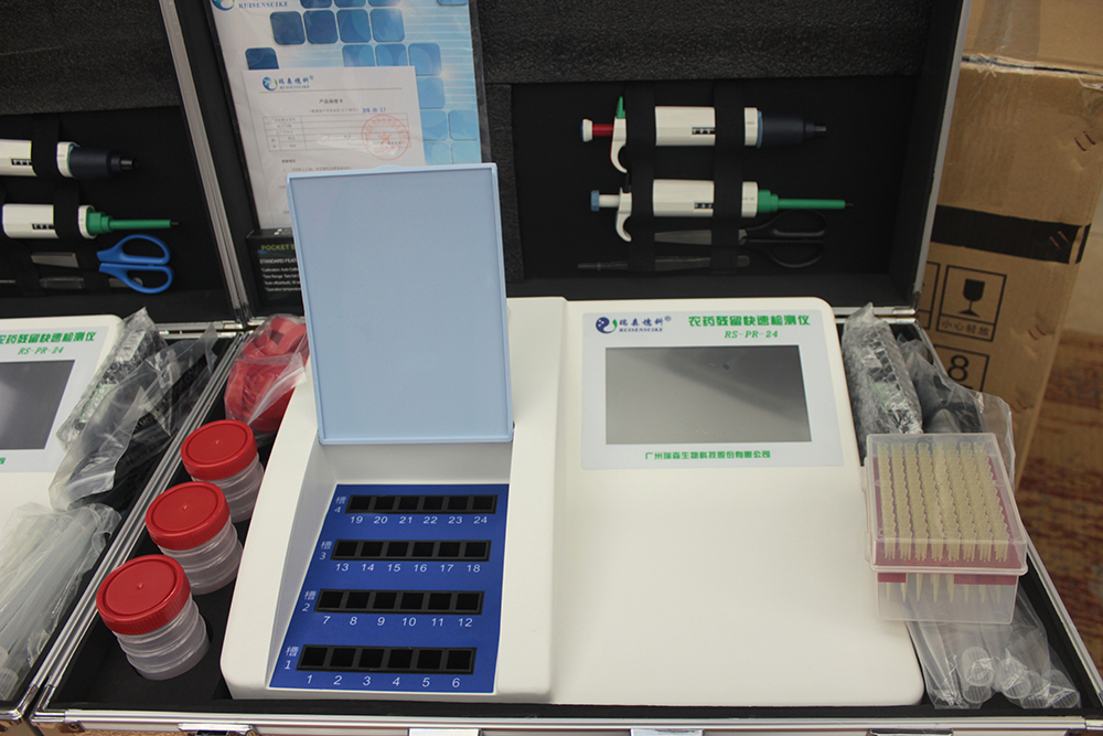 該檢測設(shè)備由“RS-PR-24農(nóng)藥殘留快速檢測儀”、“食用農(nóng)產(chǎn)品質(zhì)量安全風(fēng)險管理系統(tǒng)”兩部分組成,主要用于日常食用農(nóng)產(chǎn)品檢測。該設(shè)備具有快速準(zhǔn)確檢測農(nóng)產(chǎn)品農(nóng)藥殘留情況、實時上傳檢測數(shù)據(jù)等特點。