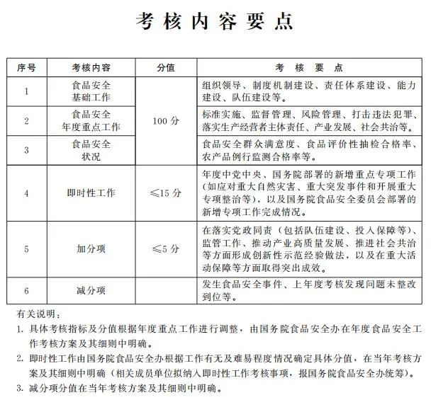 第五條 考核內(nèi)容主要包括食品安全基礎(chǔ)工作推進、年度重點工作落實、食品安全狀況等,同時設(shè)置即時性工作評價和加減分項(考核內(nèi)容要點見附件)。具體考核指標及分值在年度食品安全工作考核方案及其細則中明確,設(shè)置要科學合理,可操作、可評價、可區(qū)分,切實減輕基層負擔。